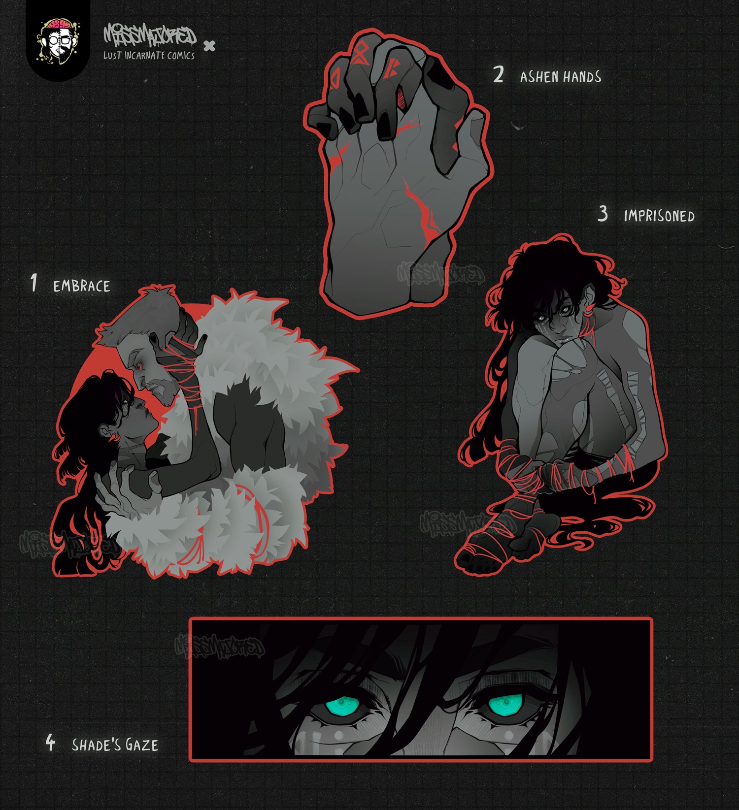 Shade and Kelik's bloody plunge into defiant romance is in full-display in this sticker set... and so is Shade's penchant for atmospheric solitude. MISSMAJORED's art will enrapture any who gaze upon it!